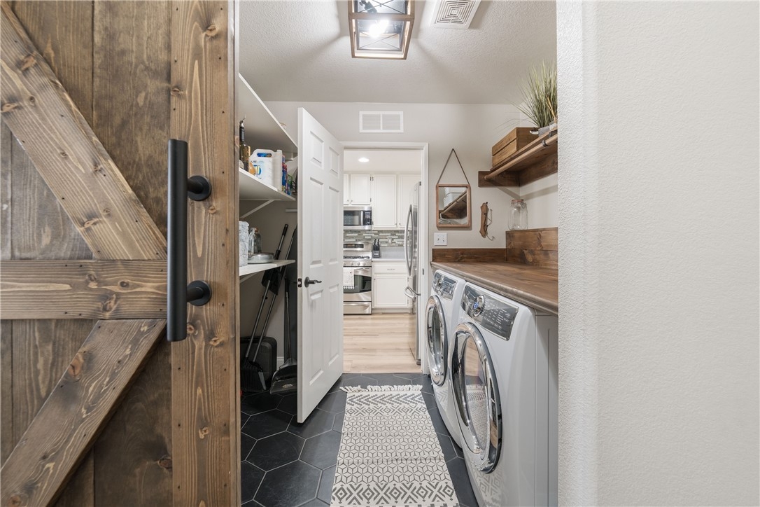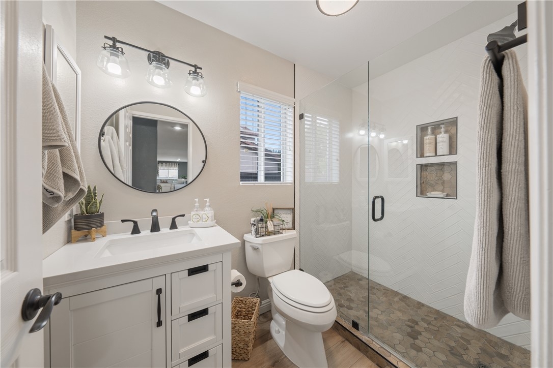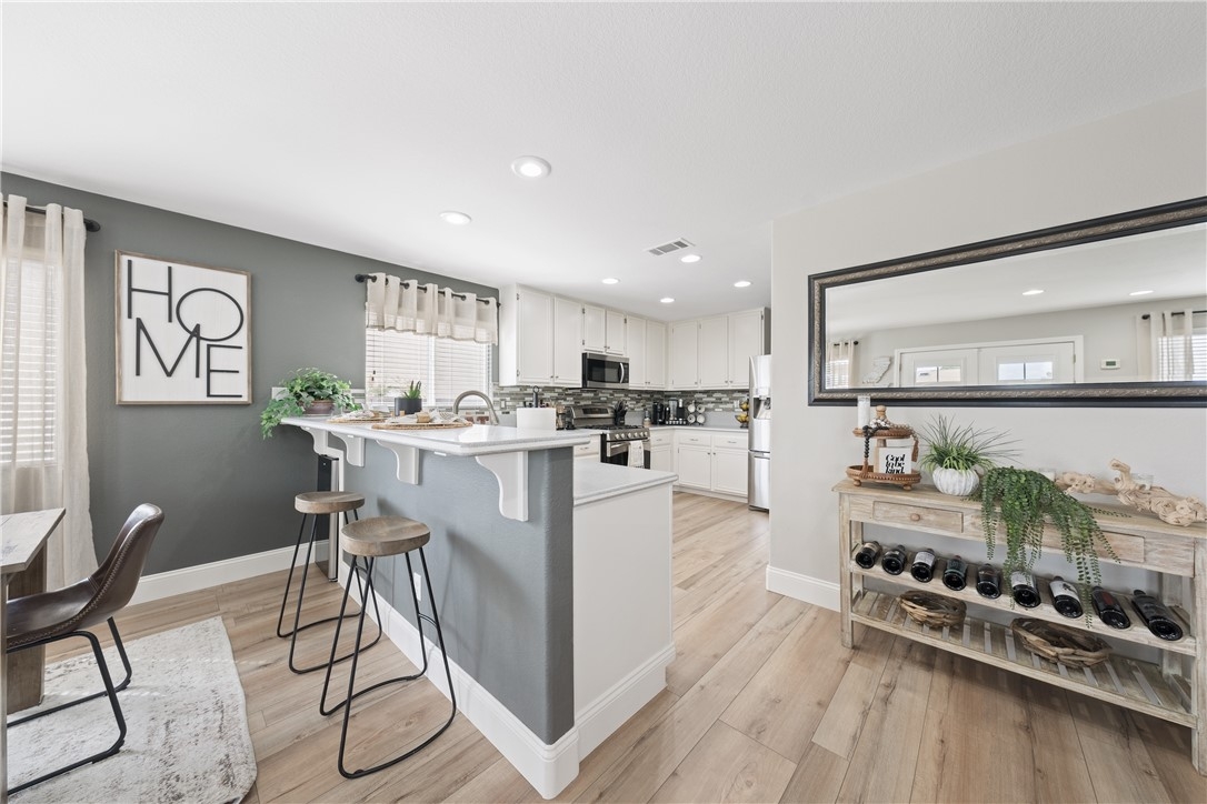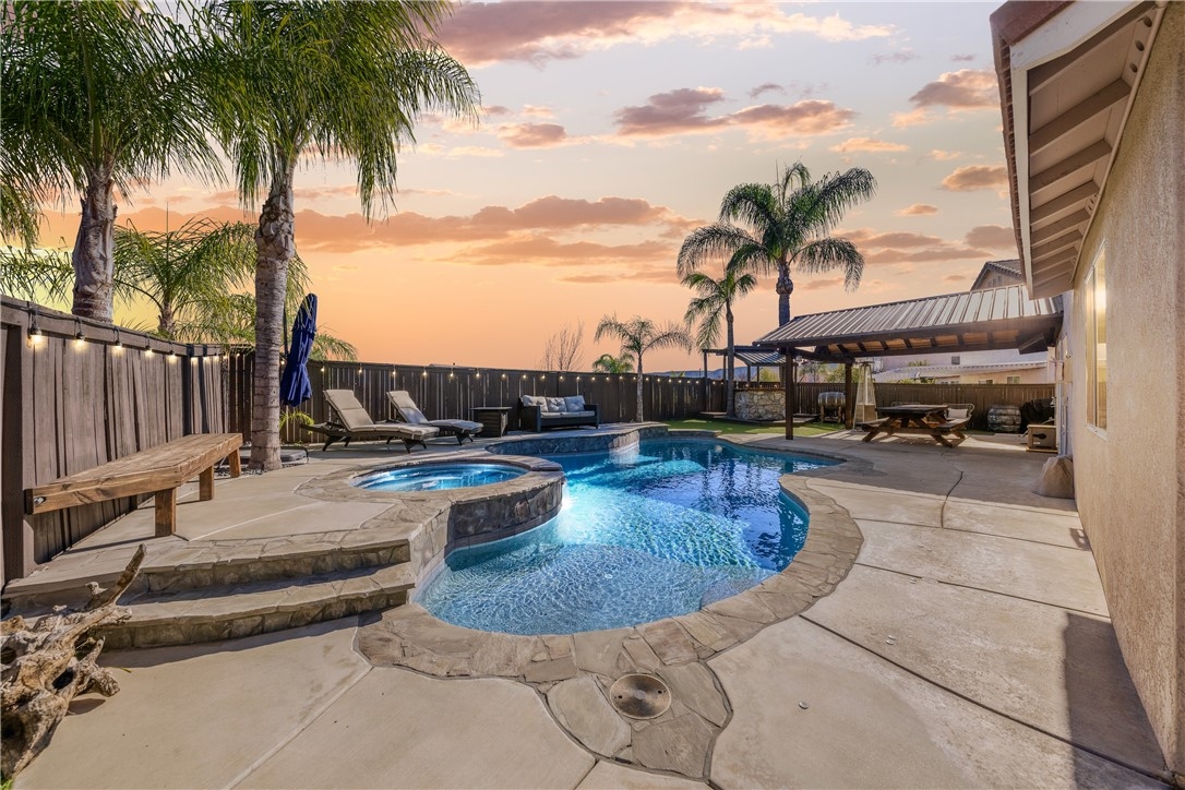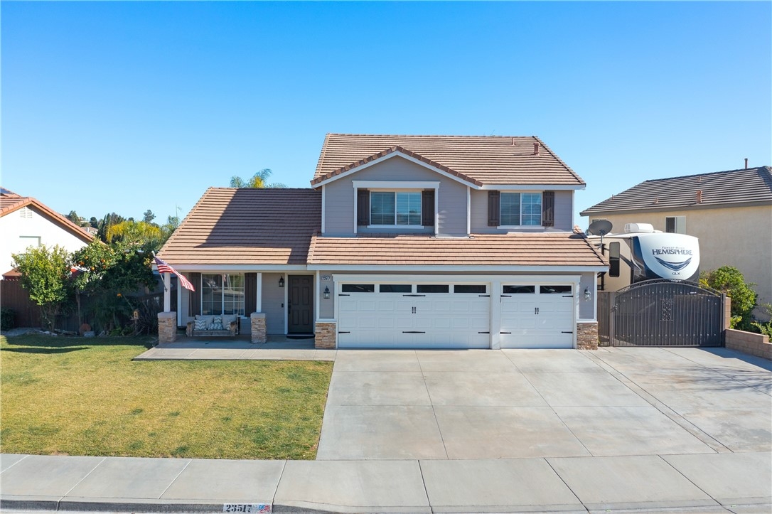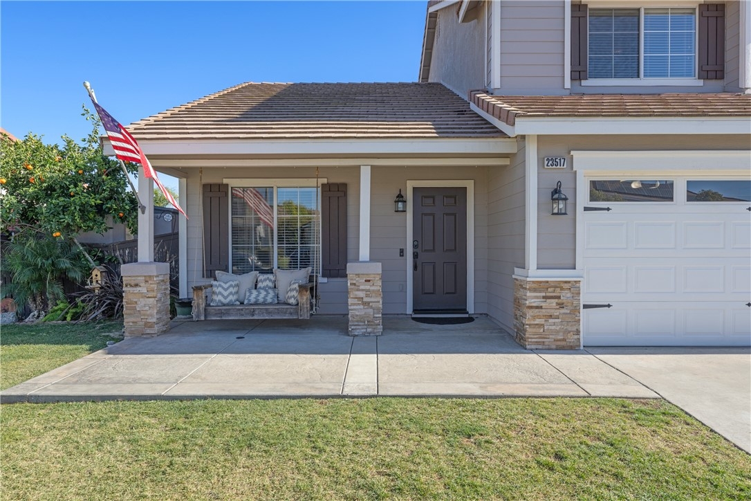 Welcome home to 23517 Mountain Breeze Drive! This absolutely gorgeous 4 bedroom, 3 bath Grizzly Ridge home offers everything you've been looking for! From the moment you pull up, the curb appeal, front porch swing, expansive front lawn and oversized driveway will catch your eye. As you enter the home, you will immediately notice the openness of the vaulted ceilings and an abundance of natural light. Gorgeous LVP flooring will guide you through the entire lower level which features a downstairs bedroom (currently being used as an office) and a full bathroom with a custom tile step in shower and updated vanity. Make your way into the family room which is appointed with a stack stone gas fireplace, recessed lighting throughout and stunning views of the entertainers backyard. Off the family room is the dining space and open concept kitchen, complete with Corian countertops, white cabinetry, tile backsplash and stainless steel appliances. Adjacent to the kitchen is the jack and jill Laundry Room with has been updated with a custom wood folding table, gorgeous black hexagon tile flooring and generous storage space. Exit through the custom made barn door into the hall which offers direct access to the 3 car garage, a hall closet with ample storage space and a walk in pantry. Step out through the French doors to your entertainers' backyard which offers a custom wood A Frame patio cover with updated lighting, built in bar, gorgeous palm trees and a completely remodeled mini pebble Salt water Pool and Spa with variable speed pump, LED lights and Pentair WIFI enabled Intellicenter control system. Upstairs you will be met with a generous sized loft, 2 additional bedrooms, full shared bath and the Primary Suite and bathroom, complete with his and her sinks, soaking tub, step in shower and a large walk in closet. Not to be overlooked, the 3 car garage has been recently updated with Epoxy flooring, custom cabinetry, a shiplap wall and built in storage racks. The side yard lends to the generous 40' deep RV Parking which is equipped with 30 AMP service and a custom gate. Located within the award winning Murrieta Valley School District and a short drive to Temecula Valley Wine Country, this home does not disappoint. Don't miss your opportunity to tour Mountain Breeze today!